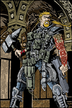 Ha ha! Indeed! He was in the comic first - I actually designed him. I was so stoked when I heard he would be a playable character online! They did a great job matching my drawings. The same with Jace, though they made him to hard looking and beefy I think...