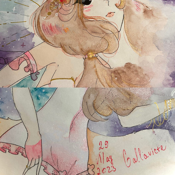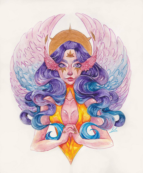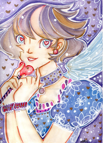 Encore un petit personnage de mon futur projet "La Fin des Neiges". Elle n'aura pas les ailes sous forme humaine, pour le reste ça sera assez similaire^^Cette aquarelle est un cadeau pour un ami ^^