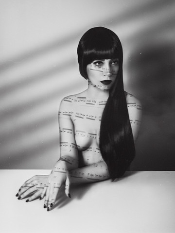 The artist seems to confirm this awareness in the equally stunning "Color Dust III" when she appropriates more modern ornamentation for a bizarre and masking eye patch. And where her ritualized body has become fetishized in lingerie.