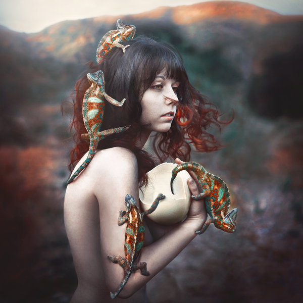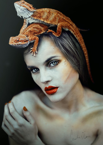 Love the slightly offbeat beauty: heavy-looking eyelids, cute ears (okay, the one I can see), spectacular freckles. More than a touch of femme fatale, but there's also an innocence. The lizard is a good addition -- so unexpected.
