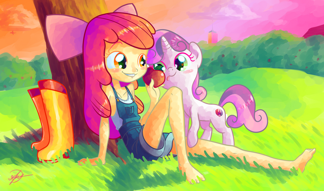 Applebloom sitting on a barrel of the finest quality grapejuice, made with the power of sisterly LSome thoughts: