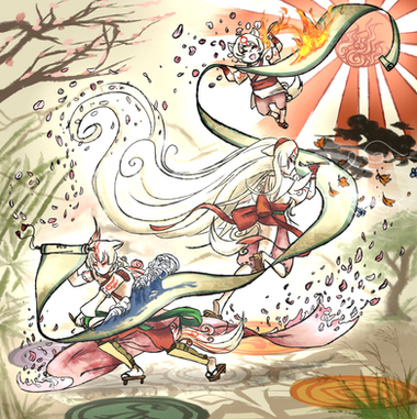 Halfway through I wanted to do a second Okami pic; one of princess fuse (you see her running on the bridge) with all the dogs from the game