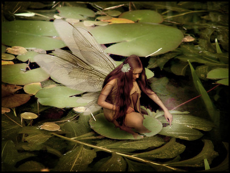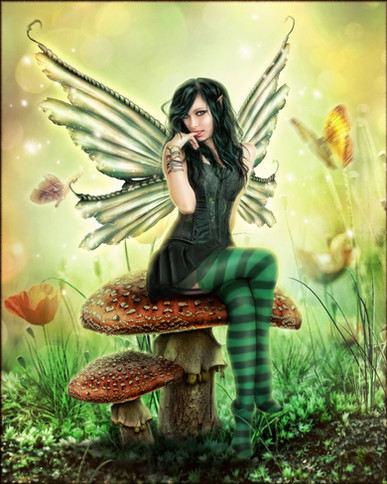 the wings are almost jeweled and the mushroom looks so organic i want to eat it!! the moon really does light everything up nicely ^_^ the leaves so big just accent the idea of her being a little fairy creature. and how did you do the reflection in the water?? talent!!