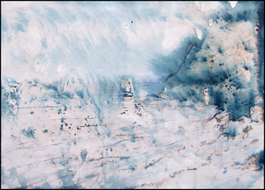 lines-in other works-numers? code? words? i dont kow. on a vast brown a white broken horizonand then above more brown.