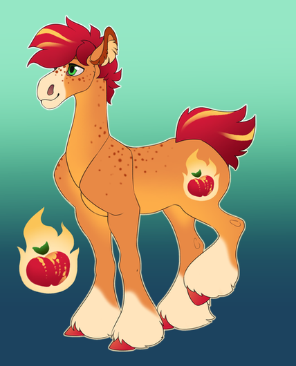 He may seem scary, what with his…bombastic way of roasting apples, but rest assured, Suncrisp wouldn’t hurt a fly. They’re a sweetheart, really. Kind to foals, easily flustered around a pretty mare and runs to hide behind their mothers or sisters at any sign of danger, even if said danger is a mouse in the barn.