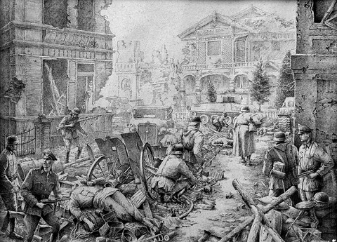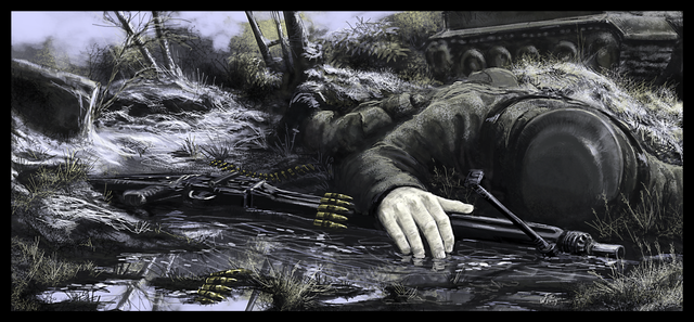 i wonder if he's an enemy soldier, who is hiding, otherwise he would try to show himself for a rescue. i think it is great artistically.