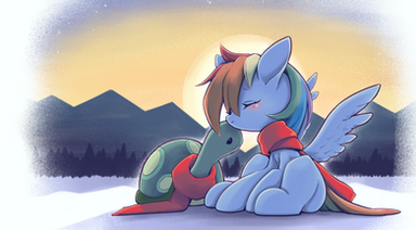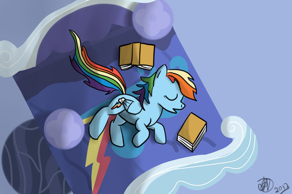 This piece was made for EQD's Rainbow Dash Day.Rainbow's had a long day and fell asleep reading one of her books. Tank being the loving pet that he is, covers her up so she won't get cold during the night.