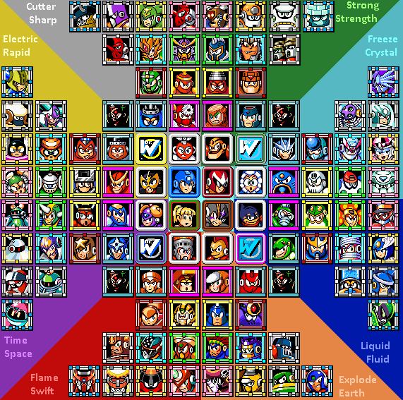 *Weapons can be given more than just the types shown above. RM's would be weak to the typing of their original weakness. I.E. Cutman would take extra damage from any Ground-typed weapon, Airman gets double from Grass-types, etc.