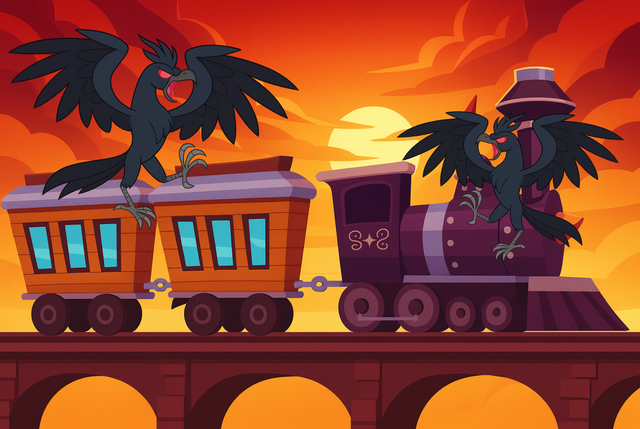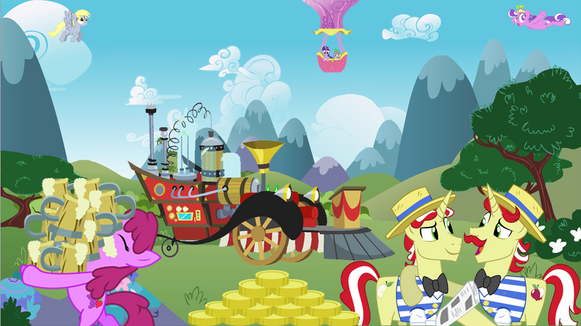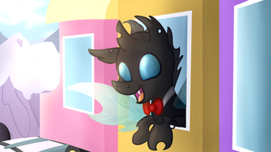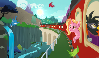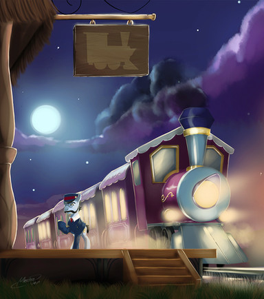 This piece took 5hrs but by joe was it worth it! Here's part three and we made it over the tracks! Where to now? Probably to the mare's room soon? Lightning Bliss is running out of paper bags to puke up in lol. It appears that Rail's spell to boost the steam out of the engine worked!Part 7 -