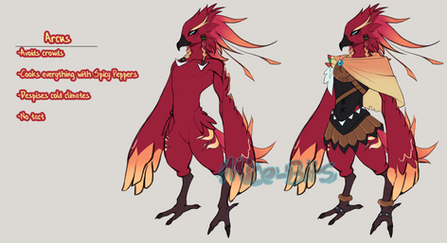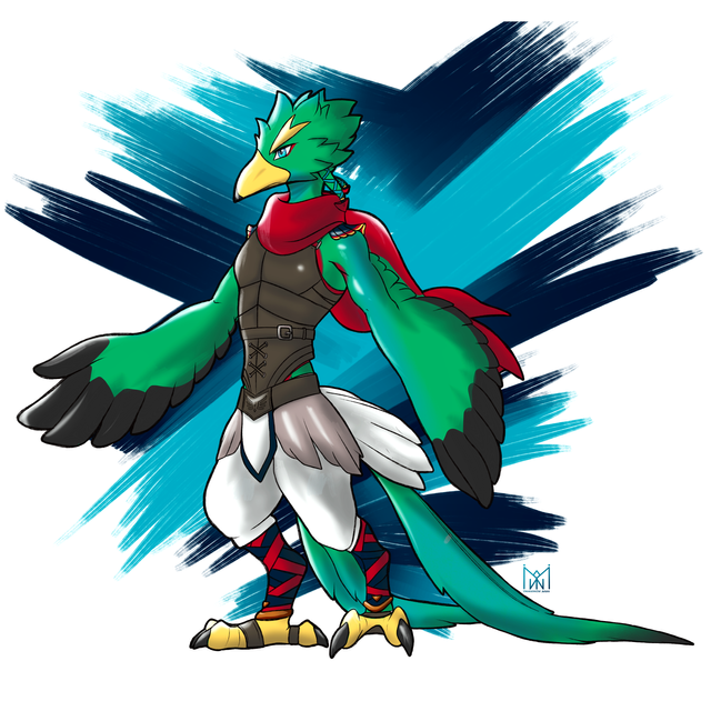 Is it Ree-doh? Reh-doh? Even Redoh doesn’t know how to pronounce his name either. It is said that Redoh’s name came from his first words quite some time after he hatched, being something between “ree” and “reh” and also from his parent’s constant disputes of how his name is said before hatching. Others say he was named after the Divine Beast Vah Medoh or the name of his race, the Rito. Some may guess that maybe he will grow up as some mediator of the Chieftain, which is not far off from the reality. His old friends Clara and Fali sympathized with Redoh and decided to give him an alternate name or pseudonym of “Arden,” the R sound from his name suggested by Fali and the pronunciation of the second syllable inspired by Clara’s knowledge of ancient Hyrulean gods, one of said Gods referred as “Din.” Despite his confusion in Clara’s explanation of ancient culture that existed beyond the recent centuries, he later accepted to use his pseudonym. Before Fali left to travel to the vast lands beyond the Hebra province, he gave Redoh/Arden a long, red scarf since he seemed to be fond of it since they were chicks/fledglings.