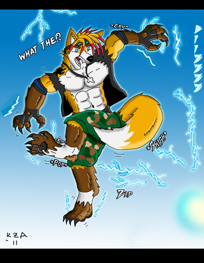 #beast #claws #devious #evil #eyes #feral #fox #glowing #lightning #rage #ripping #sharp #shirt #shorts #tf #transformation #werefox #foxlightning