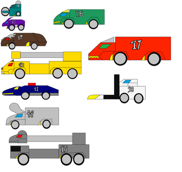 A chart featuring the redesigned main vehicles of the AF10 series. These vehicles are supposed to be actual size comparisons with each other and their drivers and they're shown from different angles to show their features.These are the vehicles: