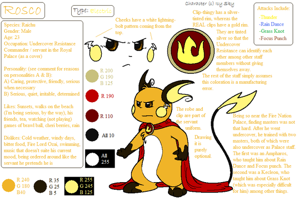 It's been a while since I've done this kind of ref. sheet, but here's one for Jolt, finally. For those who are wondering, the two Raichu are Thunder (Jolt's father, who is in fact a shiny Alolan Form Raichu) and Astra (Jolt's mother), and the Pichu is Tesla (Jolt's little sister).General Info
