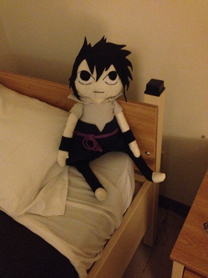 Omg the way this thing stares up at me as I do my homework... Its so cute.Anyway this is my possessed Sasuke medicom doll that my boyfriend gave me last Christmas. Its done freaky things like shifting to the other side of my lamppost from where it was at the previous night, and its head turned to look up at my boyfriend once when he was holding him.