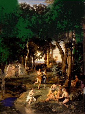 the background is beautiful, but i don't understand the figures and their relationship to each other. the perspective seems to be a bit off, as the figures in the distance seem too large in proportion to the nearest. well, that's my two cents worth.