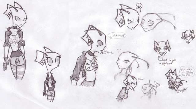 Nutshelled Background: Zerg had been initially been a Biologist for the Irken Empire, geared toward the production of medications, steroids and serums to enhance and elongate the life of individuals regardless of species. She never had any military training or any desire to engage in any violent or barbaric actions, content to remain in a lab and work alongside her best friend and lab partner, Mar Sart. The two had crafted several inventions beside those meant for enhancing health, including a “Life Core” which was meant to serve as a portable power core and replace generators. They eventually became pressured by the irken military to engineer weapons, and steroids to enhance soldiers’ performance on the battlefield. One weapon produced under military pressure is the “Arrowhead Bomb”, which was quickly patented and yet never released to the military or general public.
