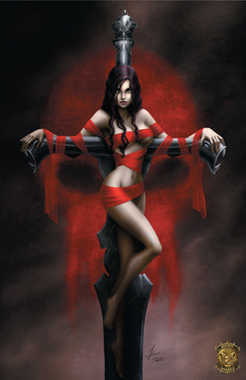 This composition arrests the eye the second the image loads on the monitor. Contrast light/dark binaries of color and flawlessly toned skin draw the eye along the twisted and unnerving sensuality of this image. It's greatest strength, I believe, lies within the asymmetry of the picture, everything moves along unusual line-art that deceives the eye into expecting something different, such as the shape of the richly detailed crucifix, or the sharp crags it sticks out of. The only thing that is unusual is the placing of the sunburst in the background, which feels somewhat off to me, as though it should be raised higher or simply reduced and dropped to the bottom creating a more aurora borealis effect along the bottom of the picture frame. All in all, spectacular work with multiple themes combined with stunning sophistication and talent. An instant favorite.