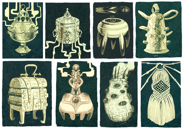 Alchemy tools art-studiesThe shapes of these tools were referenced from engravings related to the alchemical craft, as well as photos of the reconstruction of alchemists' laboratories.