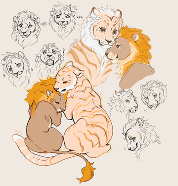 OCs sketches.Big set of training with lions/human size and different poses. Hugs and strange things with Xep and Kosey. I was extremely impressed. LIONS ARE BIG MAH GOD.