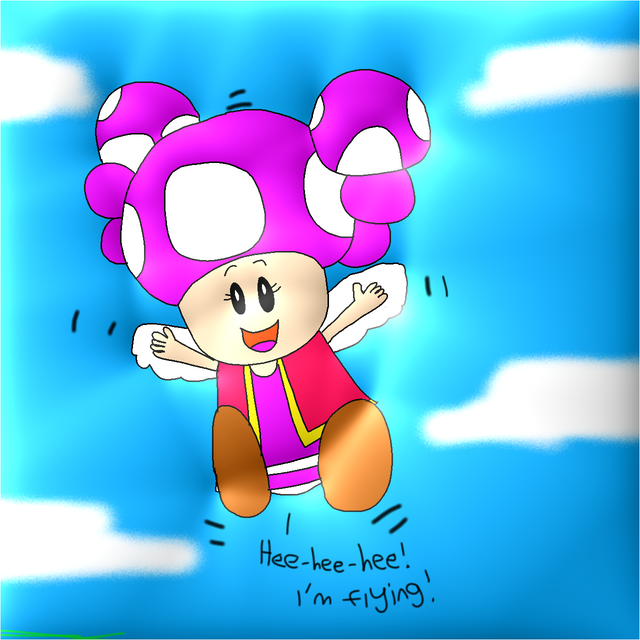 a comm from my friend shaymin5000555 of toadette flying with her balloons<3
