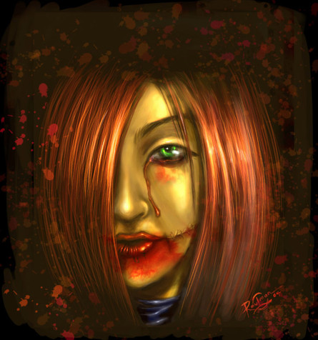 Hmm...at first I wondered why this was submitted under the "dark" category, but then I saw her lips...blood smeared or smudged, and I also get this overall evil feel from the girl. Her expression is of cruelty or something...I don't know. The dark red background seems to help emphesize this. I'd say this was a very good freehand painting. Well done.
