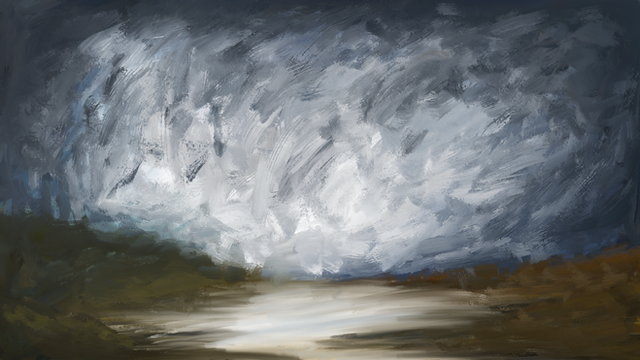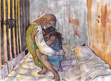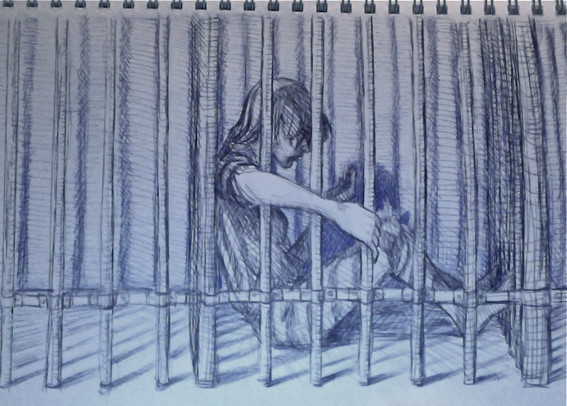 Hello again! OK first thing I noticed...I love the soft, colored-pencil type color. I always wished I could use colored pencils and make it look decent. I also like the position of the two people in the corner...the unusual perspective, I think, draws the eye right to them and their predicament. (I totally want to know the story behind these to.