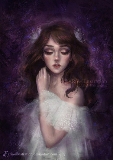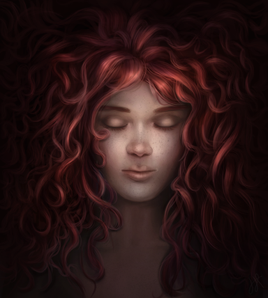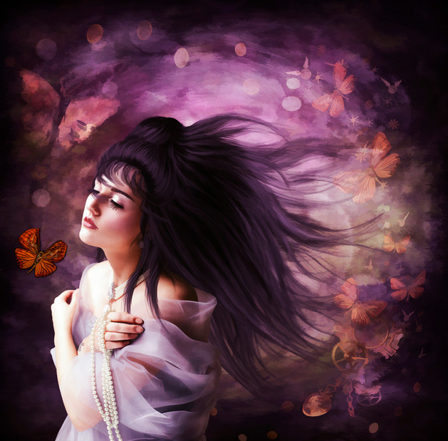 I immediately connected to this piece as I have this about this color hair, and the length is down to my behind... and it gets everywhere like this! But your's doesn't look tangled at all! It looks like elegant, flowing hair, the way the really long hair flows like a jelly fish underwater. I am in love with this piece, the butterflies are the perfect touch-- and the little sparkle specks and the glow.. really add some MAGIC in the air of this piece! She has such a peaceful look on her face, the delicate positioning of her body and hands, this is a very calming picture. It's a nice feeling that washes over you when you look at it. Very well done, I am very impressed! Can't wait to see more from you, LOVE your style, instant fan!