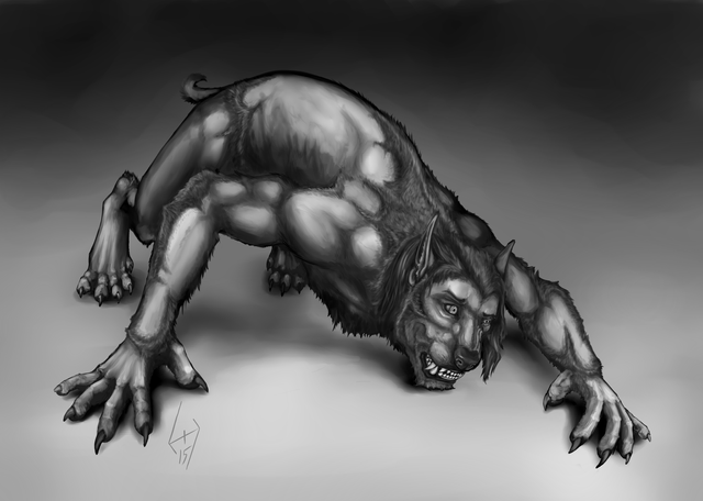 A werewolf trips and gets tangled up in her tree. Or maybe she came in through the chimney to give you the gift of lycanthropy! Hold still while she bites.