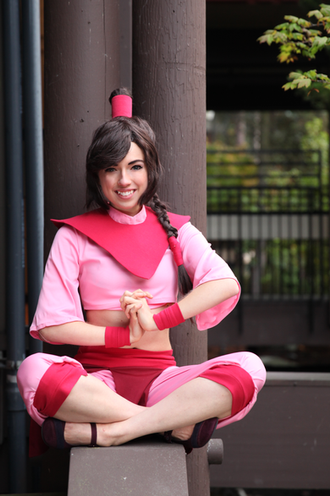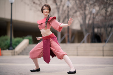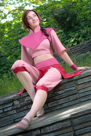 Lyn: And here's the first photo of my Ty Lee cosplay! I love how it turned out; it's so comfy and easy to wear! Haha I've already taken it to three cons so far, and it'll probably be my go-to summer cosplay for a while. This photo was fun to get, too. Lots of spinning around in circles! I quite like how my skirt ended up flaring out like a flower.Since it's our first photo of the costume, I'll also add some construction notes: The wig is a Spanish Brown color from Arda (I don't remember which one, but it's a short style and a clip-on ponytail) that I styled myself. I drafted the patterns for everything and dyed the middle pink color to be the right shade. For her skirt flaps, she had anywhere from four to six depending on the reference shot I found, so I eventually settled on five because I felt like that made them the right width, and that conveniently left a gap in the back for a pant zipper.