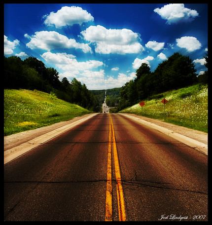 The angle of the sign really gives the picture the right impact and feel that anything is possible. It also makes me wonder what the One Way sign is indicating. What is in that direction? What might be happening just beyond the borders of the deviation?