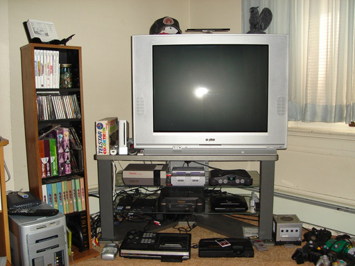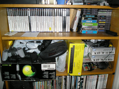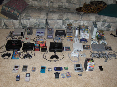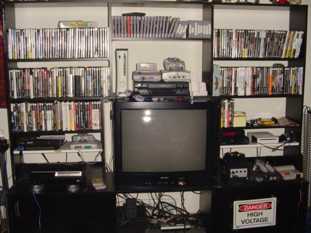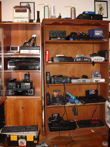 Hey everybody, this is my video game collection, it is to everyone that I still don't have a story, I have The Atari 2600, the Intellevision, and the Colecovision on top of the shelf, the third chelf has the Top Loader NES, the SNES, and the module 2 Sega Genesis, the second shelf has the N64, Nintendo Gamecube, and the Playstation, next to the TV is my Sega Saturn and my Slim Playstation 2, I also have my Sega Master System besided my shelf,my drawer contains all my game controllers and the bottom drawer has a/c adapters.I also have the original Nintendo DS, Gameboy pocket, the original gameboy advance but there not in this picture. Unfortunaly my original NES is broken so that I can't show you guys.