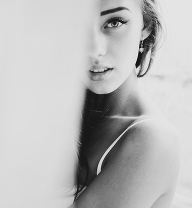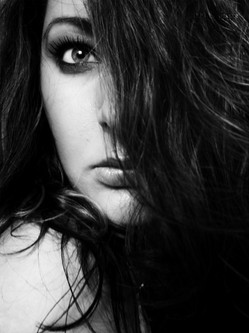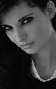 focusonthe... is right: this has a dangerous quality. It is not just her beauty but how here eye is so engaging but because there is only one eye, the viewer canot make proper eye contact so there is this tension. And her expression is so enigmatic. She is a bit scary, too powerful. Focus just on the eye. This a really clever photo.