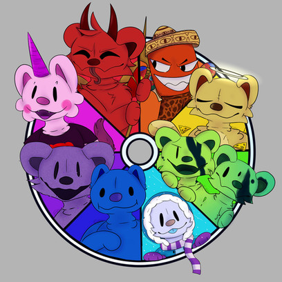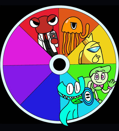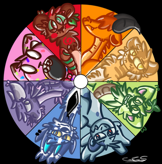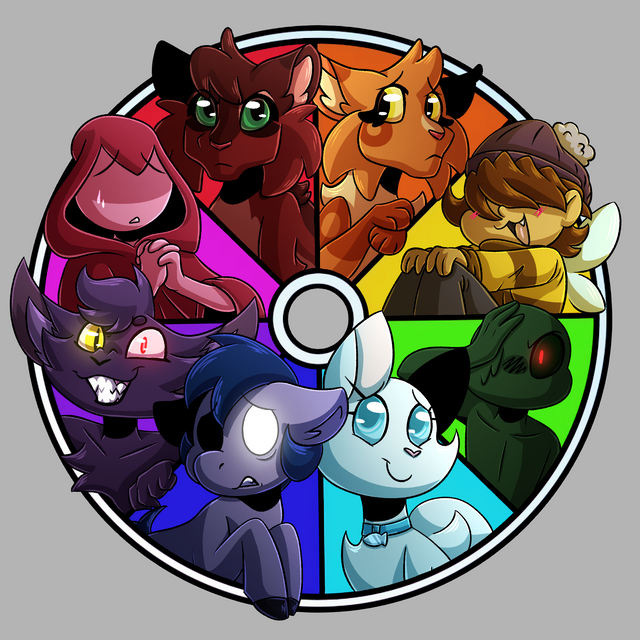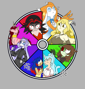 At long last, my attempt at the colour wheel meme thing! (That probably nobody cares about anymore, because I'm always far too late in joining these things...)For those unfamiliar with the meme, I needed to place a character corresponding to each colour of the rainbow into the wheel provided. Naturally, I have enough colourful characters of my own that I was able to find 8 OCs for the job: