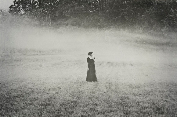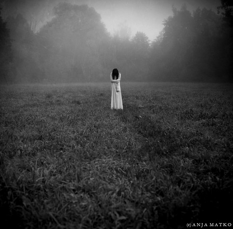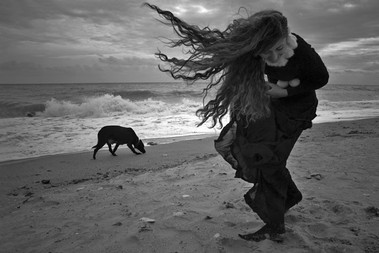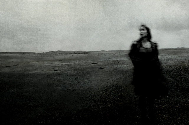 the figure in landscape always appeals to me. the elements in this shot really work for me: the low perspective with a low horizon, the black dress that contrasts the light of a sky that is still textured with clouds, the darkened frame of the