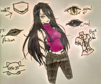 Personality: very sweet but can be mischievous, tends to act abit like her mother but if she near a person she close to she will act like her father all wacky and goofy in a fun way, very caring, others may think she bad but like her mother once said "im not bad im just drawn like that"