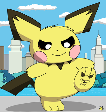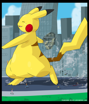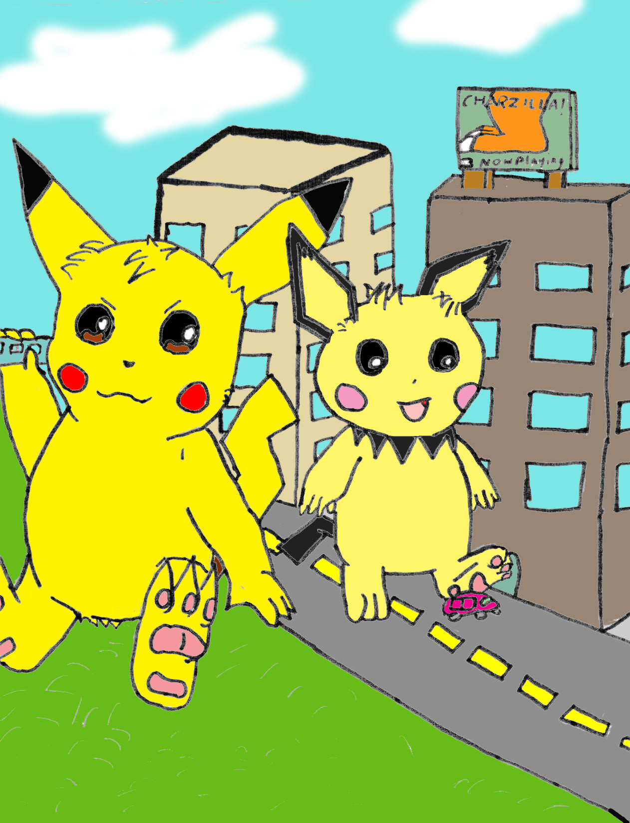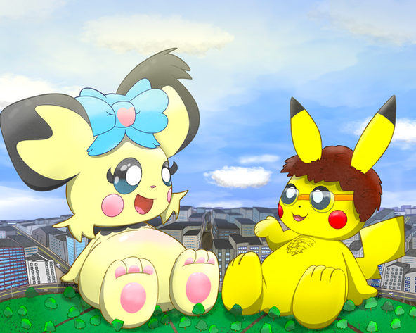 A request by Pichu2006. In this drawing a Pikachu and a Pichu are rampaging a city. Pikachu is holding a train in his hand and Pichu is about to stomp a car. I'm actually quite satisfied with the way this one came out.Related content