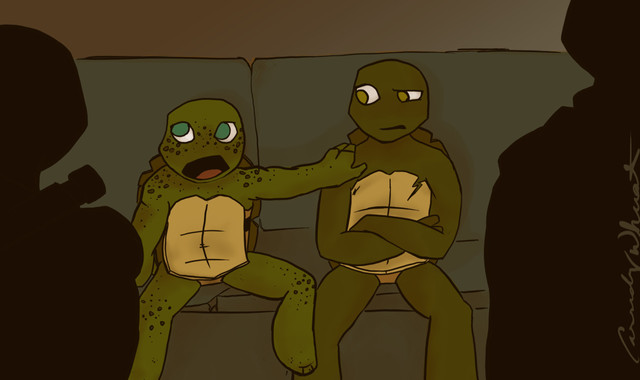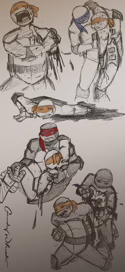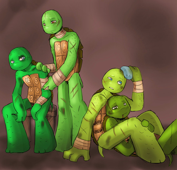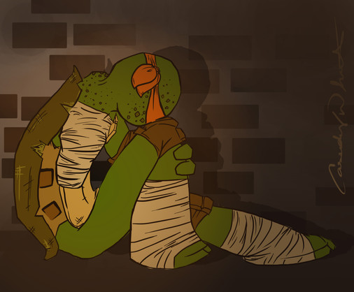 Oh wait you wanted feedback on the art sorry I was getting to that XD I get what you mean about not being 'exactly proud' of this however I haven't seen you do an injured turtle scene before and for that, I'd say you got it right on the money. Still, I like it. It makes me think of what they are possibly doing between the Slash fiasco and whatever crazy adventure they have next.