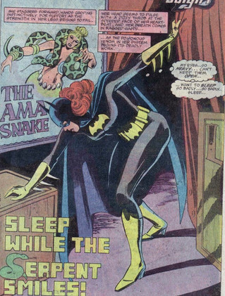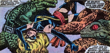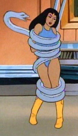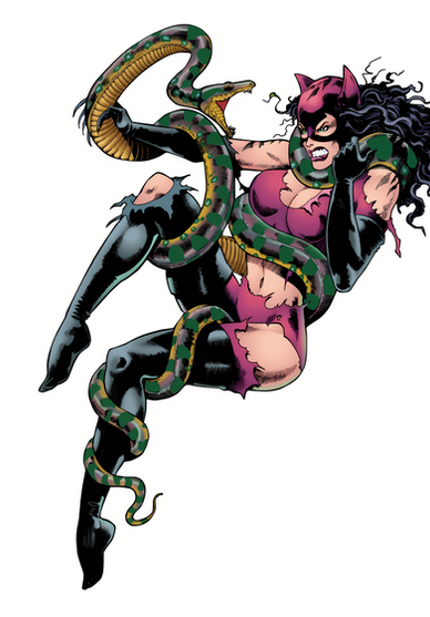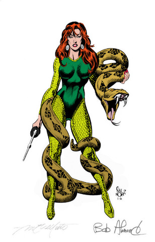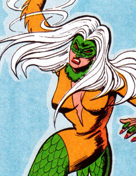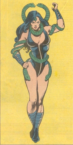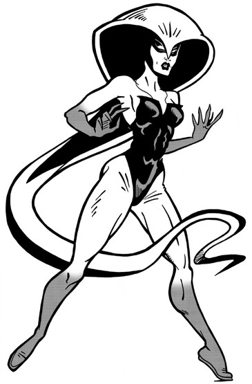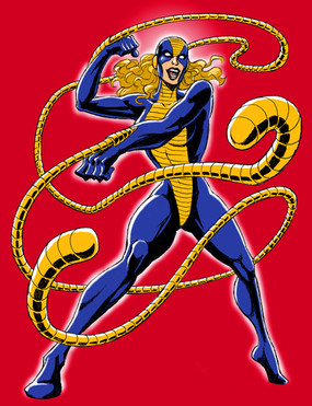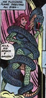 Villain. I believe she was a member of the Circus of Crime and the Serpent Society.These pictures are from The Official Handbook of the Marvel Universe, published 1985-1986.