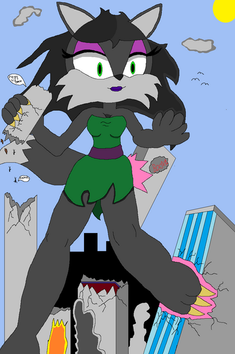 The very ground around the village trembled under Marisa's wrath unto Eggmans forces. Any and all ground troops were crushed under her sneakers which fell like giant hammers of destruction upon them. Small airships met their fate to Marisa's fists. She would either punch at them, which at her height of 200ft tall, flew through them so much they exploded on impact, or they ended up being thrown at the others.
