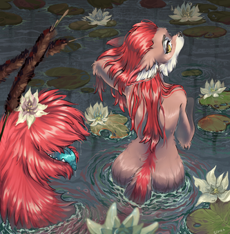 Ye just can't keep this guy clean! If he was my pet fox, I'd be hosing him off every hour or so, and he would still find a way out of the yard into swamps. He's a great guy, though. Beautiful work. Lizfox is adorable, too.