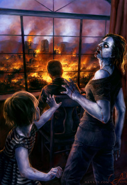 the contrast between the flames and the people is so stark and tragic. This is packed with raw emotion and I love it when simplistic color scheme can achieve that. Great work.