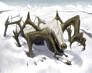 See, this is what fantasy art should be about. Despite the violence of the theme, the somewhat muted colors give a very lyrical feeling to this picture. The transition from the white, to the red, to the green gives a wonderful sens of depth. There's almost an arabesque feeling in all the complications of curves, but the diagonal thrust of the lance, the torso and abdomen of the dragon, and the thigh and calf of the knight, give a nice overall unity of movement, nicely counterpoised by the secondary diagonals of the neck and train. Excellent.