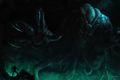 Mola, igual deberías incrementar la iluminción debajo de Cthulhu para resaltar la iluminación superior. De paso te permitiría darle algo más de entidad al desgraciado que perturba su despertar... Definir algo más las nubes en el borde del claro también ayudaría a entender el momento representado. La paleta de colores sigue tu, ya megaclásica, línea xD