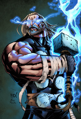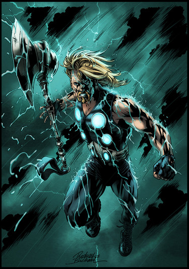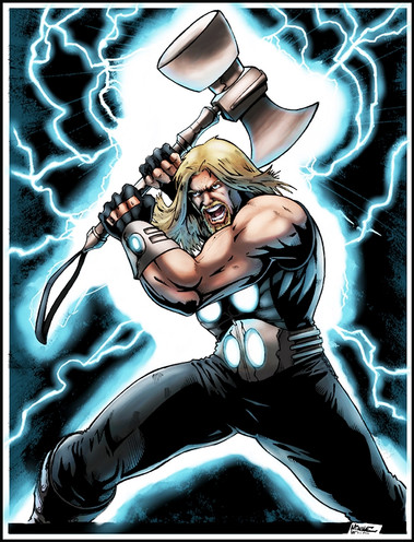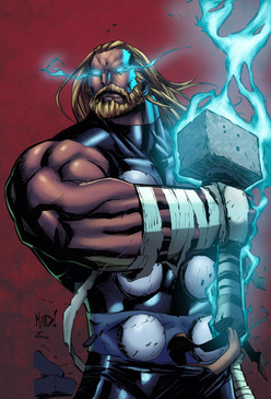 amazing colour, design and originality. very detailed and energetic. the colours that have been used are very good they all work together instead of trying to compete to stand out. the charcater has been created to a very unique standard and looks 'marvel' lous. the only thing that i recommend for this creation is perhaps for the hammer to be a bit more mythical or to more of a fantasy standard. otherwise this creation is very, very good. the background is perfect aswell, the character stands out perfectly and looks very powerful. shading is perfect and the outlines look great