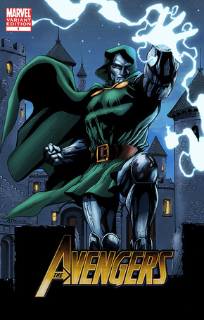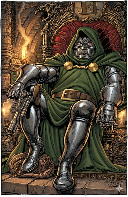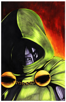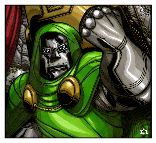 Very cool! Doom is such an awesome villain. One thing I can offer as a bit of critique is to observe material qualities. The cloth of his robes and the metal of his armor are appearing to have the same reflective qualities. The metal should reflect light brighter and sharper than the cloth and so on for the background elements. I really like the "brush stroke" look you have in the colors though with the fine lines in the color.
