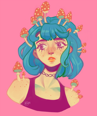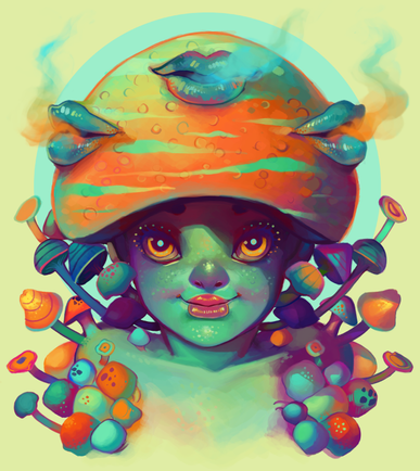 Great piece. I love mushrooms and it's so pretty to see them growing on this character with such perfect color-harmony