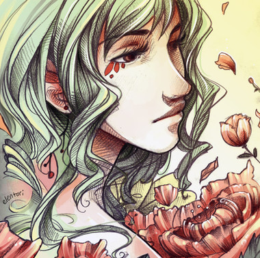 The colours and pose/ expression almost make it look like a renaissance painting. I love how you render faces and hair ♥