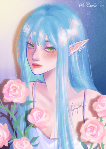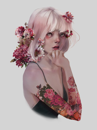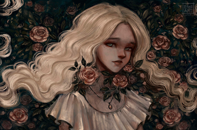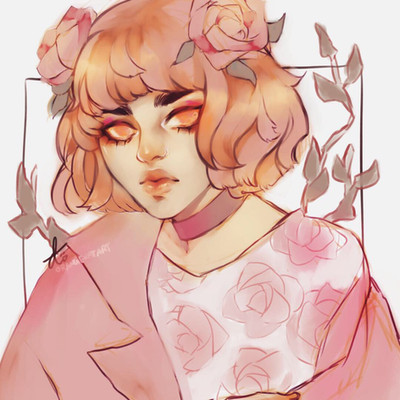 Her face and the whole painting are so beautiful and the roses enhances very well! I love how you show lineart in some places that are the focus of this piece!