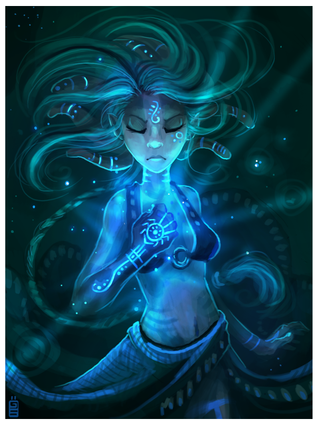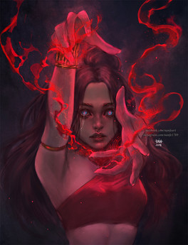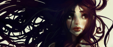 The lighting is great. Darker at the edges and "brighter" towards the focal points. The subdued colors sell the scene as this is not a happy moment; it isn't a sad moment. Also the choice in using the contrasting white to convey her blindness and the change in her hair is a superb use of the color and the brushes you used. Now that I look at it much more closely I see the hair is faintly transparent. That is another great detail that is well done.