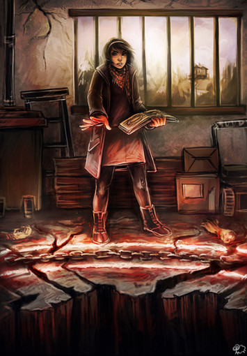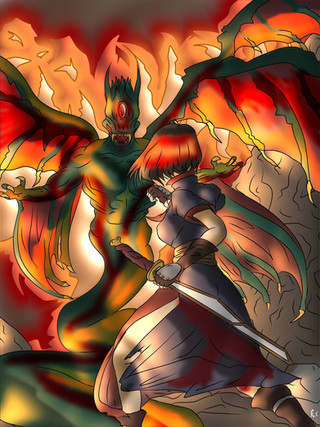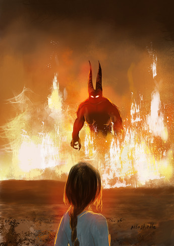 Original character Kirta defends her village.Commissioned cover art for an original story.
